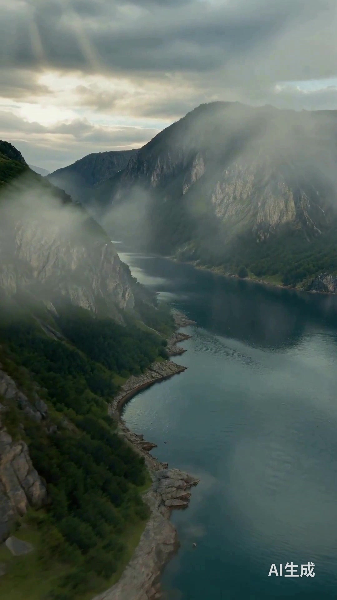 视频创作:【自然风景】航拍壮丽的挪威峡湾,清晨的雾气,阳光穿透云层,水面波光粼粼,宁静的背景音乐。