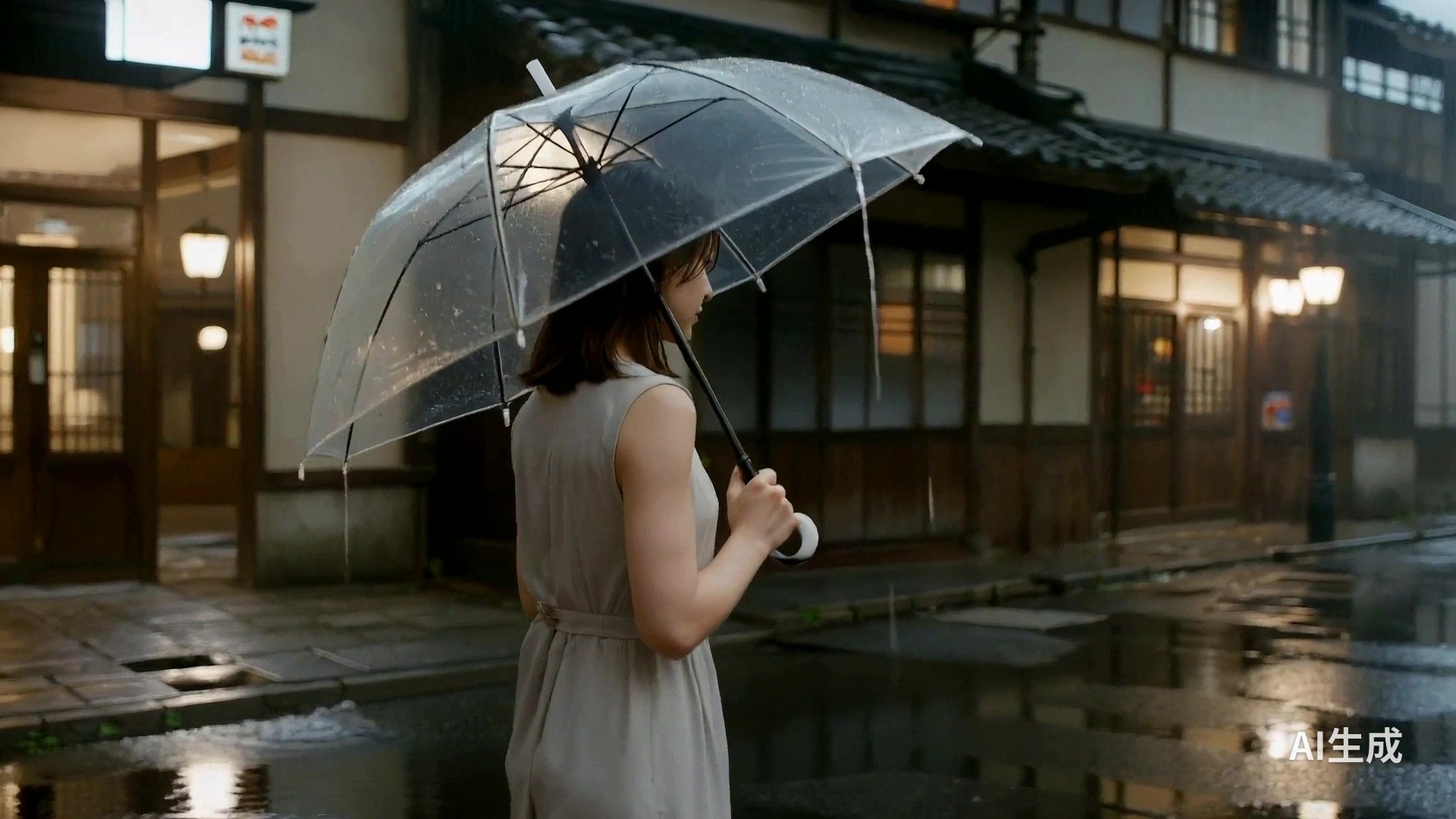 超清竖版短视频,电影级动态运镜,雨夜中的日式复古街道,暖黄路灯与冷色霓虹交织,地面积水完整反射灯光与建筑轮廓。